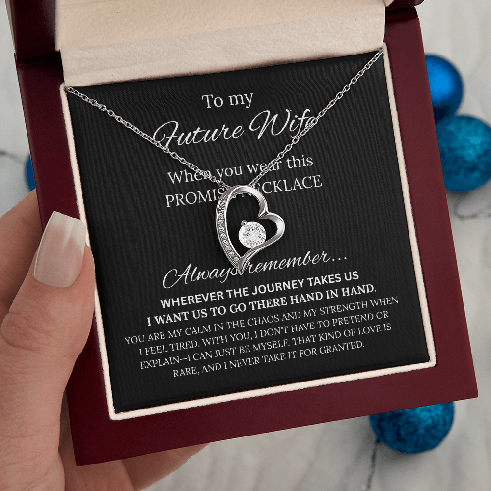 Celebrate your commitment with this meaningful necklace designed to honor the promise of forever. Each piece carries the sentiment of enduring love and devotion, making it a heartfelt gift for the woman who holds your future. Whether worn daily or saved for special moments, this necklace serves as a tangible reminder of your bond and the journey you're building together. A timeless keepsake that speaks to deep connection and lasting romance.